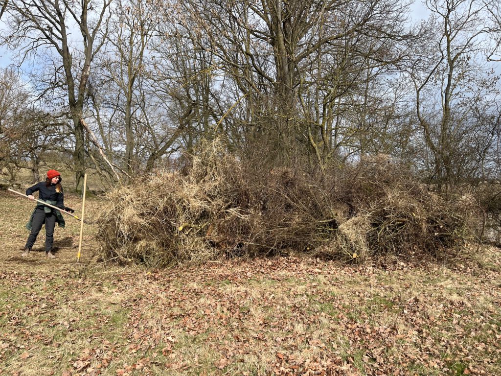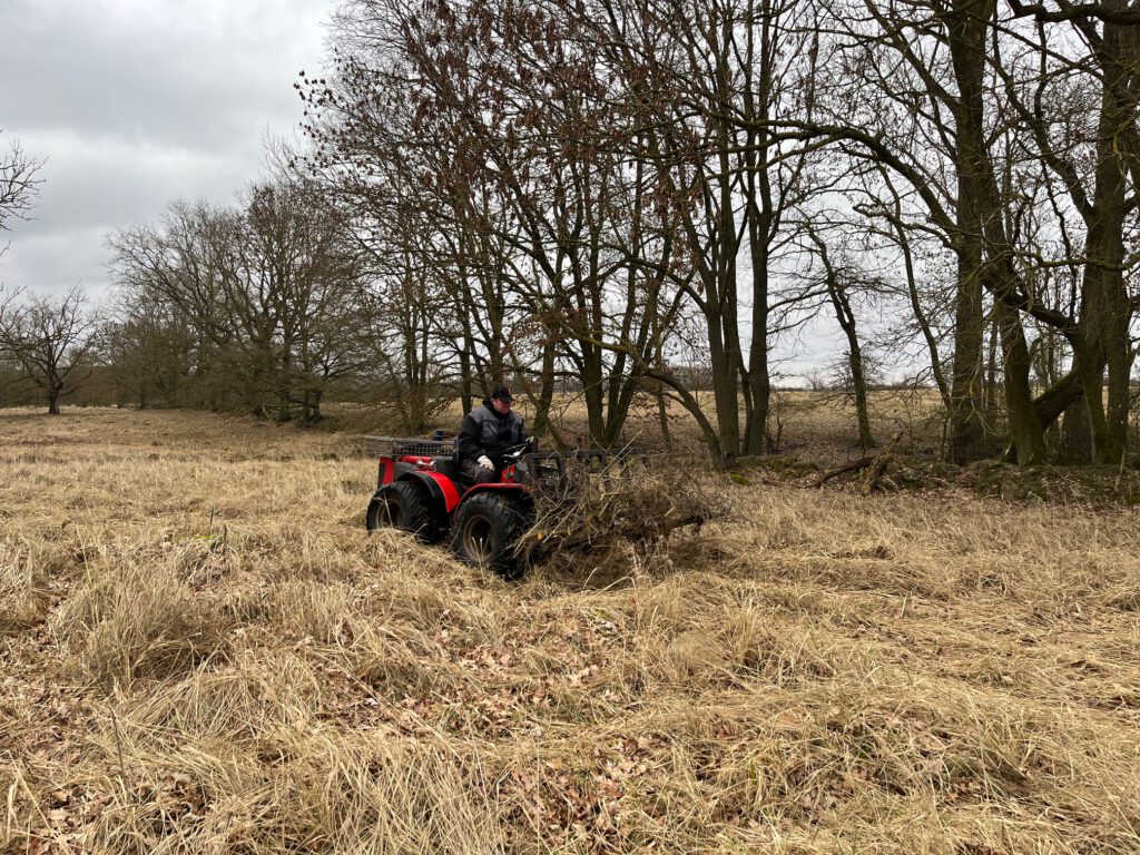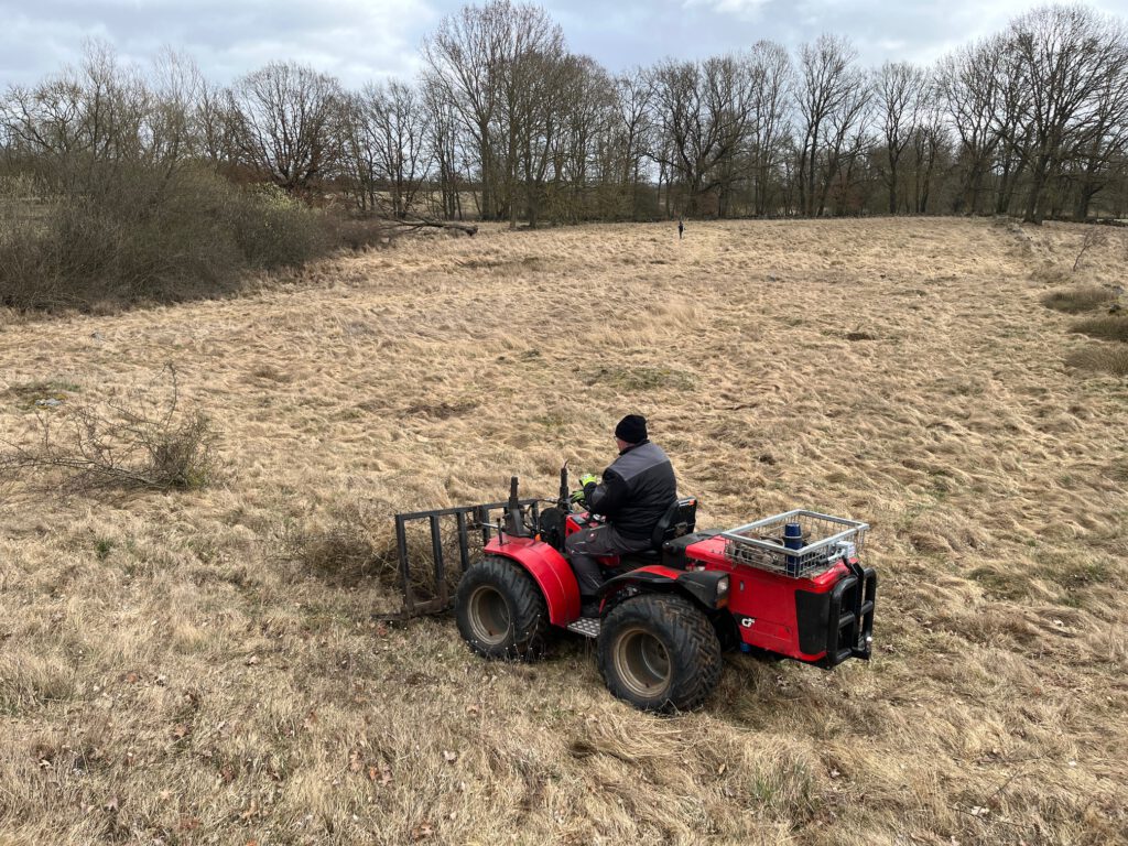 Im Rahmen mehrerer Einsätze wurde der Fokus auf die Zurückdrängung der Gehölze gelegt. Größere Sträucher wurden mit der Kettensäge gefällt, während kleinere Gehölze mit aufgerüsteten Freischneidern bearbeitet wurden. Der Einsatz von Sägeblättern erwies sich dabei als besonders effektiv: Auch dichtere Bestände mit zahlreichen Seitentrieben konnten bodennah entfernt werden, was die Wahrscheinlichkeit eines erneuten Austriebs deutlich reduziert. Gerade in unebenem Gelände zeigte sich diese Technik als flexibel und gut handhabbar. Eine besondere Herausforderung stellte der Abtransport des Schnittguts dar. In den steileren und schwer zugänglichen Bereichen musste die Biomasse zunächst per Hand mit Forken auf Planen verladen und zum Rand des Naturschutzgebietes getragen werden. Dieser Arbeitsschritt war körperlich anspruchsvoll und zeitintensiv. In besser erreichbaren Bereichen konnte hingegen ein Kleintraktor eingesetzt werden. Dieser nahm größere Gehölzhaufen auf und transportierte sie effizient zu einem zentralen Sammelpunkt. Der Kleintraktor erwies sich insgesamt als sehr gut geeignet für die Arbeit im Gelände. Durch seine kompakte Bauweise und hohe Wendigkeit war auch ein Einsatz in Hanglagen möglich, ohne die empfindlichen Bodenstrukturen übermäßig zu belasten. Dies erleichterte die Arbeit erheblich und steigerte die Effizienz insbesondere beim Abtransport des Materials.